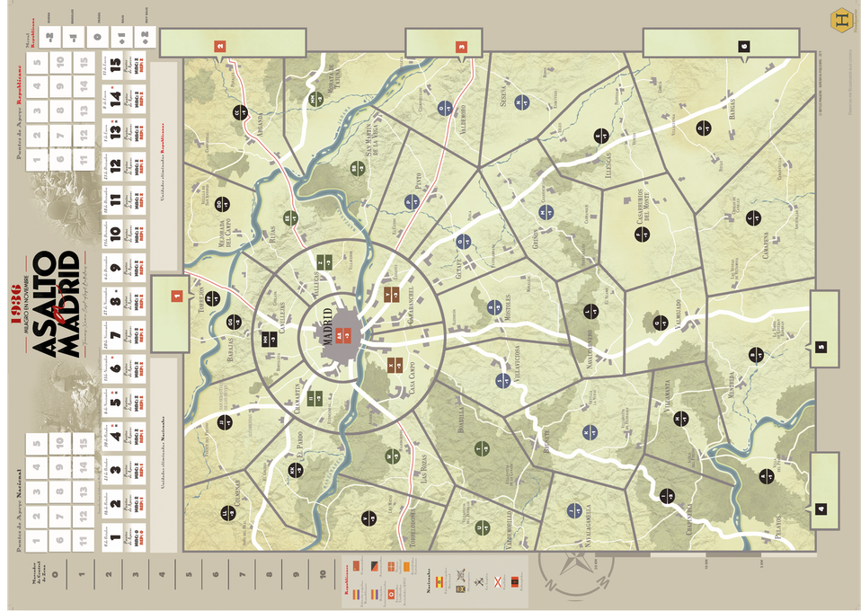 Es la edición española del juego que publicó en el 2020 la revista francesa Battles Magazine titulado Storm Over Madrid 1936: «Miracle of November«. La edición en español llegó a finales del 2020 a los mecenas y posteriormente en la propia tienda online de la editorial, si aún quedan ejemplares por 35€.Si estas interesado en conocer más de los juegos de mesa de la Guerra Civil Española, Julius Fairfax tiene una excelente recopilación en su canal de muchos de los juegos que han ido apareciendo. !!! El juego se presenta en un formato sin caja, lo que se conoce como bolsa zip. Dentro de la bolsa nos encontramos con un mapa plegado de ocupara 594x841mm, representando las cercanías a Madrid y separado por diferentes áreas de control, el autor es Olivier Revenu. En la parte superior del mismo nos encontramos los registros del juego necesario: turno, moral, victoria, etcétera. Los más veteranos ya tendrán su metacrilato preparado para aplastar el papel y evitar que las curvaturas naturales del papel creen una topografía artificial que hará que los contadores se deslicen. La calidad del papel es excepcional, es lo suficientemente rígido como para durar en el tiempo y parece estar satinadoLa portada del juego diseñada por David Prieto, también tiene su utilidad, pues es la hoja de ayuda para las personas. En ella encontraremos la secuencia de juego, la de combate, la tabla de moral, recordatorios del fuego defensivo, bombardeo y bajas. Pequeñas ayuda que nos acompañaran en los momentos más tensos del juego. Esta es la ayuda extra, ya que en el reverso del reglamento, esta la otra hoja de ayuda.