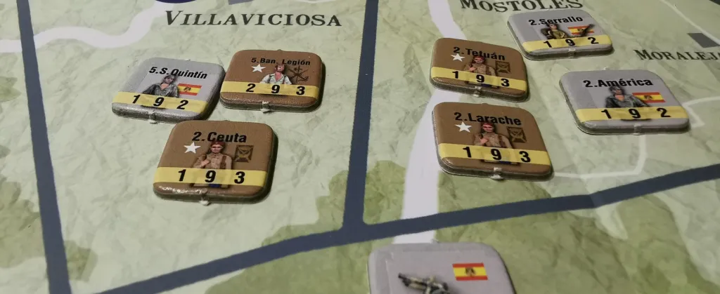 Además, la capacidad de moverse se ve afectada por la ficha que tiene menos puntos de movimiento y afortunadamente, entrar en zonas enemigas o cruzar ríos, penaliza gastando puntos extra de movimiento.En este juego se introduce el concepto de Punta de Lanza (PdL). En determinados momentos del movimiento o de los combates, designaremos a una de nuestras fichas atacante o defensora esta característica, incluso a veces esa PdL la define el contrario. Esta ficha nos servirá por ejemplo, para añadir como modificador al terreno en el valor de defensa o en caso de bombardeo para restarlo. La PdL será también la ficha que deberá asumir más perdidas.Como se puede ver, un flujo sencillo, mover, atacar, retirarse o avanzar, hasta la resolución del escenario o si cae Madrid antes de finalizar el escenario.