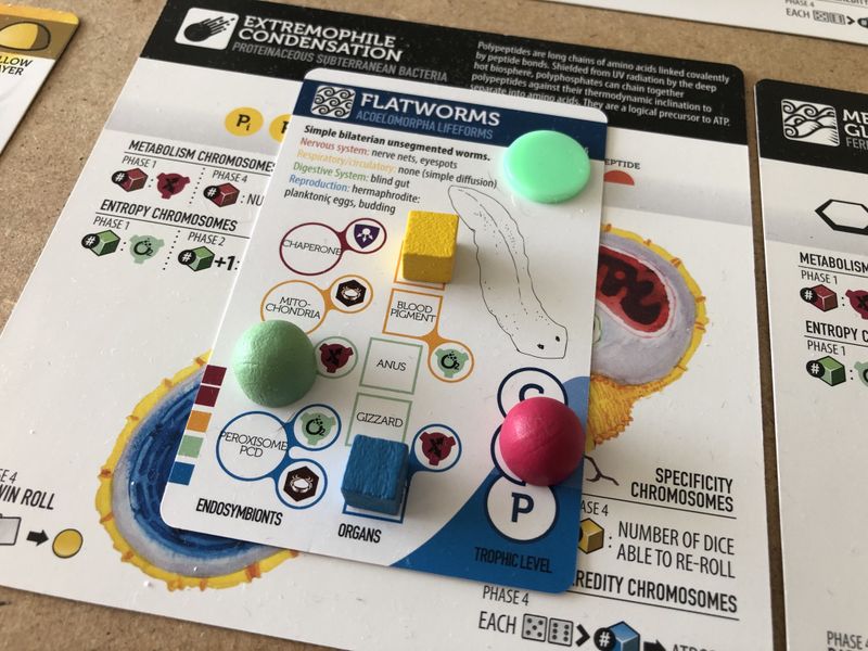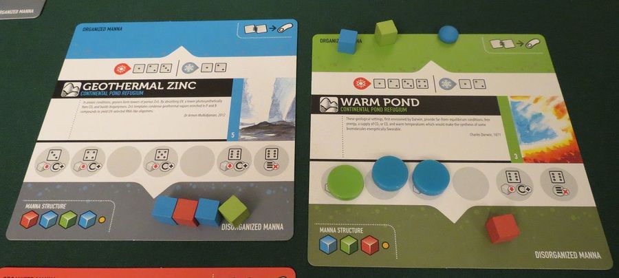 Después del evento, comienza la fase de jugador, donde colocará sus biontes en los refugios para intentar organizar el maná y conseguir crear vida. Nada más sencillo que hacer una tirada de dados para ver cuanto maná desorganizado en el refugio es atraído para organizarse y por lo tanto crear vida. El objetivo de la tirada varía dependiendo si estamos en un evento de tipo cálido o frío y los éxitos o fracasos, organizarán o desorganizarán el maná si no hemos colocado suficientes enzimas para bloquear las tiradas. Los enzimas no son más que discos de colores que taparan los fracasos de las tiradas para que estos no tengan efectos, una especie de apuesta segura. Si conseguimos una tirada con números dobles, se formará la vida y todos los biontes y manás que estén en la carta, pasarán a formar los nuevos cromosomas de la bacteria. No te emociones mucho y le pongas nombre, lo más seguro es que muera.Los cubos, pasarán a ser cromosomas que dictarán la capacidad que tiene el microorganismo para defenderse y evolucionar. Para ello, una vez por turno haremos una tirada Darwin. Por cada cubo que tenga el microorganismo se lanzará un dado y dependiendo de los resultados, podrá crear nuevos enzimas que utilizará para defenderse o multiplicarse en nuevos refugios o podrá sufrir atrofias destrozando su organismo. La vida es cruel y devastadora y el azar necesario para satisfacer a los dioses.