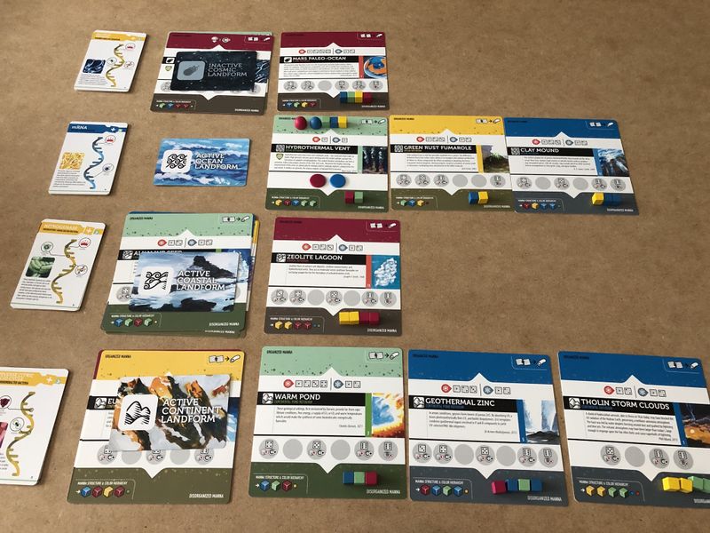 Todo comienza con cuatro refugios terrestres. Son plantillas o placas que irán saliendo a juego a medida que la tierra vaya evolucionando, ya sea por la llegada de meteoritos, por la formación de océanos y costas o por el nacimiento de nuevos espacios terrestres. Allí se almacenará el maná, que serán los cubos que construirán y harán evolucionar la vida. Cada uno cumple una función básica que permitirá que nuestra futura criatura sea capaz de evolucionar, por ello cada cubo representa aminoácidos, vesículas lípidas, bases nitrogenadas e hidrocarburos aromáticos policíclicos) que más tarde se convertirán en cromosomas para nuestra bacteria o órganos para nuestro «bicho».Para ello contamos con una serie de biontes (semiesferas) de cuatro colores, uno por jugador. De la misma forma que los cubos, cada color tiene su significado en la vida: metabólicos, celular, absorbedor de energía y replicativo. Luego cuando evolucione a una bacteria se transformarán en cromosomas y cuando evoluciones, igualmente serán órganos de nuestro adorado organismo.¿Parece complicado? Nada más lejos de la realidad. El juego es realmente sencillo más allá de toda la tematización. Un turno comienza cuando se revela una carta de evento, en ella, nos indica todo lo que sucede en esos dos cientos mil años, ya sean formación de nuevos refugios, activación de los viejos, trastornos terrestres y atmosféricos que se encargaran de generar el caos en la tierra y en consecuencia afectaran a la evolución de nuestros organismos.