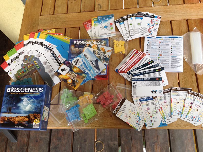 Lo bueno de este juego es que se puede ir explicando a medida que se juega. No es necesario que todos los jugadores conozcan todas las reglas, puedes iniciarles con la propia partida. Obviamente para algo más competitivo, se requiere que todos los jugadores vengan con las reglas aprendidas de casa, pero puedes sacarlo a no jugones e ir explicando la historia de la vida, porque este juego justamente va de eso, de explicar una historia.BIOS Génesis es el inicio de una trilogía de juegos que pueden jugarse por separado, pero existe un modo campaña en el cual se enlazan los tres BIOS. Tal como acaba uno, comienzan los atributos del siguiente, formando de esta forma una gran historia de la evolución de los seres vivos. Tus éxitos y fracasos te acompañaran durante toda tu vida.BIOS Genesis es de la editorial Sierra Madre Games, vio la luz en el año 2016. Más tarde el juego fue reeditado, mejorando componentes y se complementó con la salida de su segunda parte BIOS: Megafaunda 2ed, que intentaremos ver en un próximo artículo. El juego viene en una caja pequeña que cabe en la palma de la mano. Pero no os dejéis engañar, una vez que lo despliegas en mesa, necesitas una buena mesa para crear todo el escenario, de uno a cuatro jugadores y no más de 90 o 120 minutos para disfrutarlo.