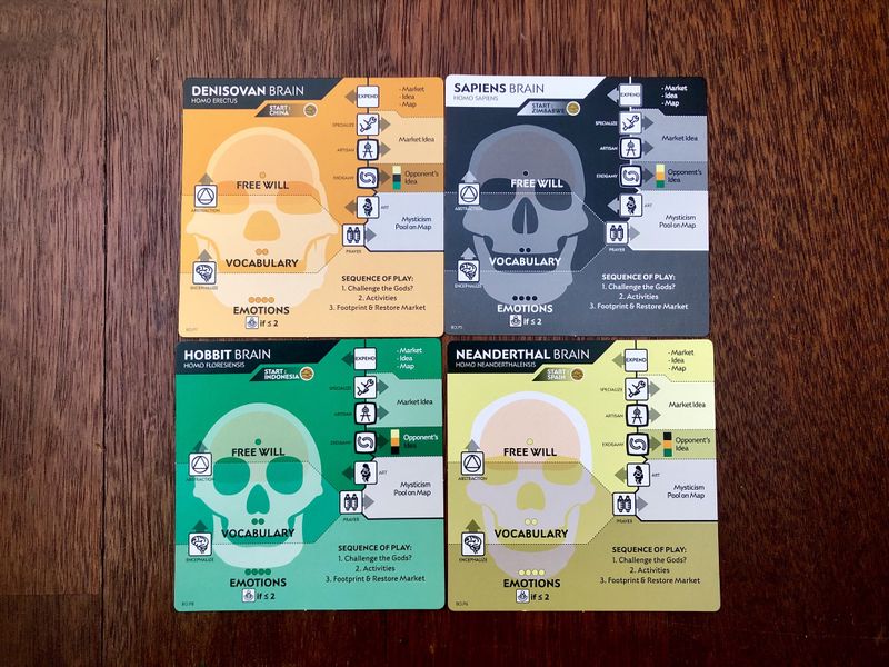 Pero antes analicemos nuestra especie, ya que además de la placa de especie recibiremos una placa de cerebro, con tres rangos y unos peones que colocaremos sobre ella, indicando que tan evolucionada está nuestra especie. La mayoría de los peones (que es la moneda del juego) irán en la parte de las emociones, un par de ellos en el vocabulario y el último que nos queda al libre albedrío. Eso condiciona lo inteligente que puede ser nuestra especie. Cuanto más emocional sea, más utilizaremos el garrote y la piedra para hacernos entender. Cuanto más libre albedrío posea, más independiente y con mayor capacidad de adquirir nuevas ideas y cimientos.