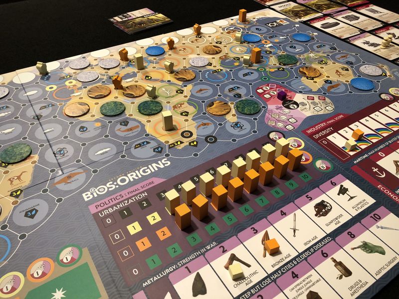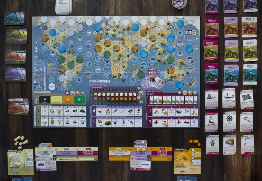 Porque con este juego, cerramos la trilogía BIOS, estamos en el paso final de la evolución. Nuestros antepasados eran bacterias en el BIOS Génesis hasta que se convirtieron en macroorganismos. Luego en el BIOS Megafauna nos adueñamos del planeta y expandimos nuestra especie por la tierra y si sobrevivimos, nos adentraremos en este BIOS Origins, donde seremos simios creciendo intelectualmente por medio del misticismo, la tecnología y alcanzando la industria. Una carrera intelectual y formativa de lo que somos nosotros en realidad.El juego es independiente del resto, no obstante, se puede jugar en forma de campaña. De uno a cuatro jugadores, en un periodo de 90 a 120 minutos de una experiencia donde relatarás la historia de tu propia especie, conquistando los continentes terrestres o los acuáticos. Tienes que evolucionar tu especie antes los cambios naturales e interactuar con el resto de las especies que caminan o nada por este nuevo mundo.Comenzamos con una pequeña placa de especie donde al azar se decidirá si nuestra especie está más versada a la cultura, a la política o a la industria, nuestra clase. Dependiendo de la elección, obtendremos unas habilidades u otras, ya que la placa contiene dos líneas de acciones que nos permitirán en cada turno seleccionar una única acción de cada línea. Al principio esas serán las opciones que tendrá nuestra especie, pero no las únicas ya que con el tiempo nuestra especie irá evolucionando y adquiriendo ideas o cimientos que la harán más fuerte y estable.