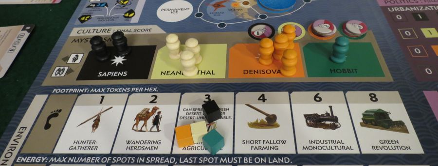 Lo interesante de comprar las ideas, es que con ellas podemos adquirir una mejora instantánea a modo de eureka y nos quedaremos con ella, para disfrute de nuestra especie si cumplimos los requisitos de mantenerla, obteniendo además nuevas acciones. Existen en el tablero seis marcadores para ir viendo el progreso de nuestra especie, tres por tipo de clase. En el ámbito cultural, encontraremos un track de misticismo, donde irán nuestros peones para adorar a los dioses, otro de huella, donde nos limitará la cantidad máxima de piezas por hexágono y finalmente la energía, que nos indicará cuanto podrán avanzar nuestros migrantes.En la parte central del tablero estará la política. El track de urbanización será donde colocaremos las ciudades disponibles, al final del juego, cuantas más ciudades tengamos creadas, más puntos de victoria. El apartado de bienestar tiene dos tracks, el de metalurgia que nos indicará que tan belicosa es nuestra tribu y el de inmunología, que tan fuerte será nuestra tribu a las pandemias que asola(rá)n la tierra. Como véis, el sistema es bastante temático y sobre todo bastante dependiente de como vayamos avanzando nuestra especie contaremos con más o menos ventajas. El tema está muy pegado al juego, el tema está en cada una de sus cartas, en cada una de sus acciones. Phil Eklund nunca defrauda.Para finalizar, el apartado de industria dispone de un track para conocer que cantidad de disidentes hay en nuestra especie, a mayor cantidad de espacio, más puntos de victoria al final del juego. Los disidentes serán los migrantes de nuestra especie que van teniendo problemas con la clase social que dirige la especie y que podrían llevar a provocar una revolución y cambiar la propia clase. Bajo el track de diversidad está el apartado económico, en el track de marítimo que nos permitirá avanzar por mar y el de información que nos permite llevar al mercado más o menos peones, así como albergar más o menos ideas.