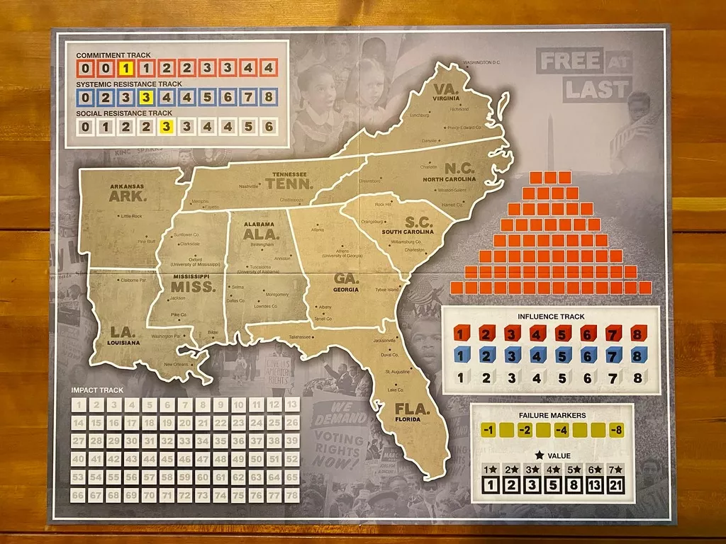 La fortuna quiso que las protestas por todo Estados Unidos de Norteamérica se elevasen ante tales injusticias y los movimientos sociales de protesta germinaran con marchas, sentadas publicas, ocupación de edificios y resistencia o confrontaciones no violentas ante la autoridad y las leyes injustas. En Agosto de 1963 en un esfuerzo titánicos de todas las organizaciones y en contra del presidente John F. Kennedy, tuvo lugar la famosa marcha sobre Washington, donde Martin Luther King pronunció uno de los discursos más emotivos de la historia. “I have a dream”.Desde entonces, la lucha pacífica continua.Este juego semi-cooperativo de dos a seis jugadores, intenta representar la lucha de las organizaciones sociales frente a un gobierno y un sistema injusto, que oprimía a una parte de la sociedad por ser diferentes en su nacimiento y aspecto. Lo publica la editorial Dietz Fundation, que también publicó en su día el 1979: Revolution in Iran aquí su reseña. Sus autores son Damon Stone y Ted Torgerson. El juego se puede encontrar en tiendas por un precio que oscila los 60-70€. !!! Un tablero montado de 51x41cm, con una parte de los estados más implicados en el movimiento social, varios registros de seguimiento que servirán para medir desde la puntuación, la resistencia social, la marcha de Washington., etcétera.
