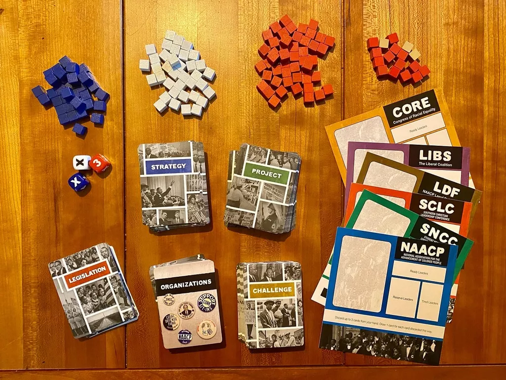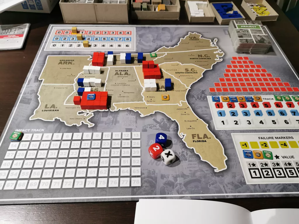 Cubos. Incluye cubos para identificar a los seguidores de la causa en color rojo, en azul la oposición gubernamental y en blanco la resistencia de los ciudadanos blancos ante cada una de las acciones sociales. Tres dados del los mismos colores con valores de entre 1-4, X y K (esta última identifica al grupo terrorista Ku Klux Kan) harán que las tiradas sean un poco más aleatorias. Con el libro de reglas de 24 páginas viene otro de contexto histórico que nos acercará a la realidad de lo que se vivió en esas fechas.Para finalizar más de 245 cartas repartidas en proyectos, retos, legislaciones y estrategia, serán el motor del juego. Cada carta con una imagen y personalidades implicadas en el movimiento, aportarán más contexto al juego. Desafortunadamente no tienen leyenda histórica como otros juegos que haría que brillase aún más en la partida y en los conocimientos de las personas frente al tablero.