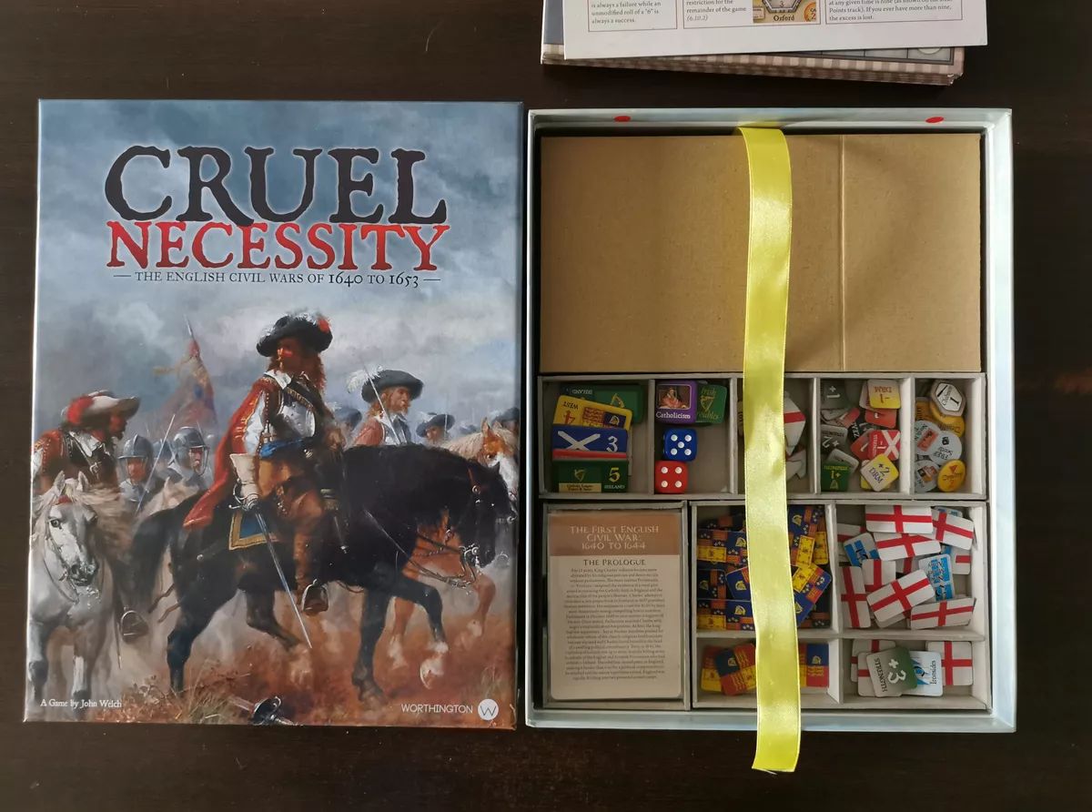 <p class="">This is a reprint/deluxification of the VPG classic, CRUEL NECESSITY. It will be printed with super high quality components. The box, board, and counters will be thick and mounted. The player aids will have the largest font possible and be on nice quality card stock. </p><p class="">Designer John Welch has updated Victory Conditions and gone through Q & A, and errata from the 1st edition. There wasn't a ton of clean up to do, but we have done our best to update the game where necessary or desired by John Welch. </p><p class="">This solitaire game, suitable for group and classroom cooperative game play, tells the story of the English Civil Wars (1640-53) through its key events and decision points. You attempt to stop the advance of four armies bent on destroying Parliament and Puritanism, whom you represent; simply holding on to London is not enough.</p><p class="">Each of the three English Civil Wars are replayed through the use of separate card decks that recreate the historical military and political events that could spell doom to the Parliamentarian forces. There are civil wars going on not just in England, but in Scotland and Ireland too; and each will have varying impact on the play of the game at different times.</p><p class="">The title comes from the purported response to the beheading of King Charles by his implacable foe, Oliver Cromwell, who remarked that this act of regicide was a “cruel necessity.”</p>