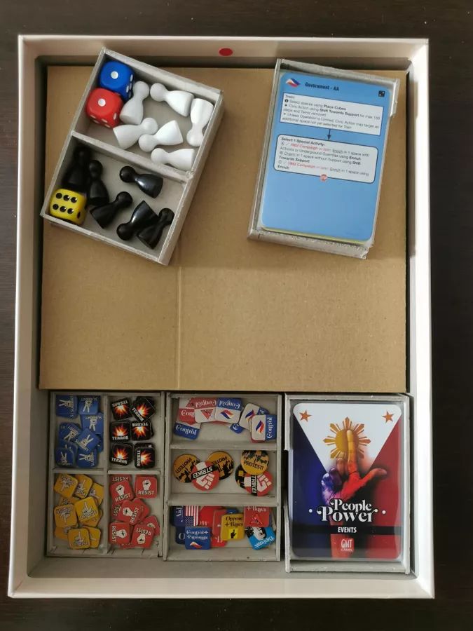 People Power: Insurgency in the Philippines, 1983-1986 is volume XI of the highly-praised and popular COIN series originally designed by Volko Ruhnke. This is one of only two games in the COIN series that feature three separate factions, instead of the customary four.The first faction is the Government, symbolized by the personal rule of Ferdinand Marcos, his wife Imelda, and his political cronies and military forces. Second are the Insurgents represented by the New People’s Army (or NPA). The NPA sought a national uprising from both the urban and rural populace. Finally, the third faction are the non-violent Reformers, embodied by Aquino’s widow, Corazon. She, along with her allies and supporters in that moment of tragedy, revived a platform of social justice and unrelenting momentum that would irrevocably change the Philippine political landscape immeasurably.For players new to the COIN Series, or for those looking to teach the the series to their friends, People Power will serve as an excellent introductory game. It was designed for simplicity and quick play, utilizing many of the basic COIN Series mechanics. The 22" x 17" map aids in introducing the game to a new player, as it presents only two types of terrain - Cities and Countrysides (where the latter amalgamates the rural settings of the island nation as well as much lightly-habitable terrain of jungles and mountains). Don't let the fast play and basic systems fool you, though. There are still plenty of strategic puzzles and inter-player backstabbing to be had! Also, People Power includes a new feature for the COIN Series - a Key Personality mini-hand procedure that represents the effectiveness of various generals and power brokers adding a new dimension to player actions and decisions.