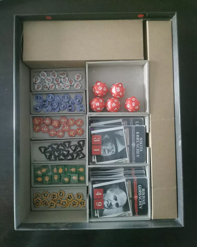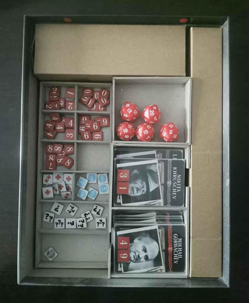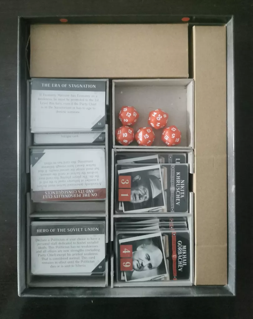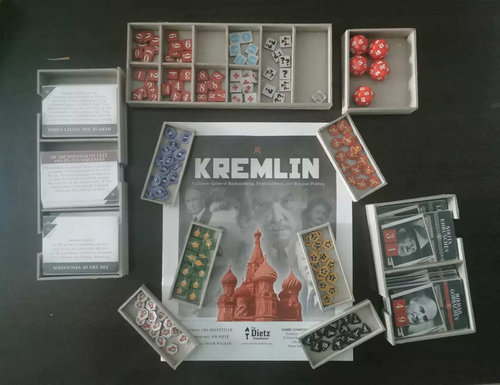 Originalmente lanzado por Fata Morgana en la década de 1980, KREMLIN es un juego de mesa de estilo europeo en el que los jugadores compiten para controlar el Partido Comunista de la Unión Soviética.El Jolly Roger KREMLIN presenta un arte actualizado y mejores componentes creados al estilo de los carteles de propaganda soviéticos de la década de 1930. Esta edición tiene un error en el tablero que hace que el nombre del juego cubra parte de los gráficos y el texto del tablero.Kremlin se juega durante un máximo de diez turnos, y termina tan pronto como el Jefe del Partido saluda con éxito tres veces en el desfile del Primero de Mayo o cuando tantos políticos están muertos o en Siberia que el Jefe del Partido puede disolver el Politburó y tomar el poder completo para sí mismo.Cada turno tiene fases. Las más importantes de ellas son los juicios de la KGB (que pueden enviar a los miembros del partido a Siberia o al cementerio) y las Investigaciones de Espionaje del Ministerio de Defensa, que también pueden obligar a los políticos a tomar vacaciones invernales en el gulag. En el caso del KGB, el truco es que cuanto más alto en la jerarquía esté el objetivo, más difícil será derribarlo, y los jefes del partido tienden a cambiar a los líderes del KGB que disparan a los de arriba... Para el ministro de Defensa, sus investigaciones requieren un juicio para tener éxito... y un voto de culpabilidad, y eso no siempre es posible en el Comité Central.¿El truco? Los jugadores asignan influencia en secreto al principio del juego y no la revelan hasta que se utiliza, lo que significa que nadie sabe quién controla el KGB o cualquier otro ministerio, no hasta que se revela la influencia... e incluso entonces, ¿quién sabe quién sigue teniendo influencia no declarada sobre esa persona? ¡Es posible que los jugadores puedan intercambiar el control del jefe del KGB mientras este intenta determinar a quién asesinar!Una vez que la carnicería ha terminado, los jugadores tienen que sobrevivir a los estragos del envejecimiento... y cada vez que un político toma medidas, envejece más rápido de lo normal... ¿Tu estrella del partido de 50 años? Bueno, de repente está actuando como si tuviera 83, camarada. La vida en la cima tiene ese efecto. En la fase de Salud, los políticos pueden morir o enfermarse; los políticos enfermos pueden optar por ir al hospital, pero mientras están allí, no ejercen ninguna influencia y sus responsabilidades pasan a otros políticos. A veces, esto significa que tu hombre debe hacer el heroico sacrificio por la Rodina y permanecer en el trabajo incluso cuando está a las puertas de la muerte.Una vez que sabemos quién sigue vivo, el Jefe del Partido puede mover políticos entre puestos. Después de todo, él tiene el control de la burocracia. Puede mover a la gente hacia arriba y hacia abajo, y cuando termina, los ministros superiores también lo hacen, pero solo puede afectar a los políticos que están por debajo de ellos en la cadena alimentaria. Diablos, los políticos incluso pueden patrocinar a camaradas en el exilio en Siberia para que regresen al Pueblo. Por supuesto, cada persona que traigas de vuelta te envejece cinco años... ¿quieres traer de vuelta cinco? Envejece 25 años en un abrir y cerrar de ojos, Tovarich.Las cartas de intriga te permiten tomar el control de las situaciones o frustrar los planes de otros jugadores. En una de las versiones anteriores, se podía hacer que sucediera algo como Chernobyl en 1920. Esto se ha corregido, de modo que, aunque los acontecimientos pueden ser los mismos, ahora se han adaptado a la época.El turno termina con el desfile del Primero de Mayo. Si el jefe del partido está sano, puede saludar durante todo el día para hacer feliz a la gente; claramente nuestra unión socialista está prosperando. Pero si está enfermo, a veces se va temprano y no puede saludar, lo que genera dudas entre las filas. Si una facción (jugador) gana tres oleadas, gana el juego.La versión Jolly Roger ofrece tres juegos KREMLIN diferentes en una caja.El "original" con políticos ficticios, ambientado en una URSS donde las investigaciones de la KGB envían a los culpables a Siberia. Esta versión tendrá condiciones de victoria basadas en las reglas originales de Fata Morgana.Una versión inspirada en la variante de Avalon Hill titulada "Revolución". Ambientada en la década de 1920, utiliza políticos históricos y ficticios. Es un juego más violento, ya que los detenidos por la KGB son fusilados y eliminados del juego.Una nueva versión, ambientada en la URSS y Rusia modernas, una era de burocracia arraigada y alternativas para escapar de la persecución de la KGB. Esta versión introduce el concepto de "Ir al exilio" para evitar Siberia. También incluye políticos modernos a partir de la década de 1960, ya sea Kosygin o Putin y Gorbachov.