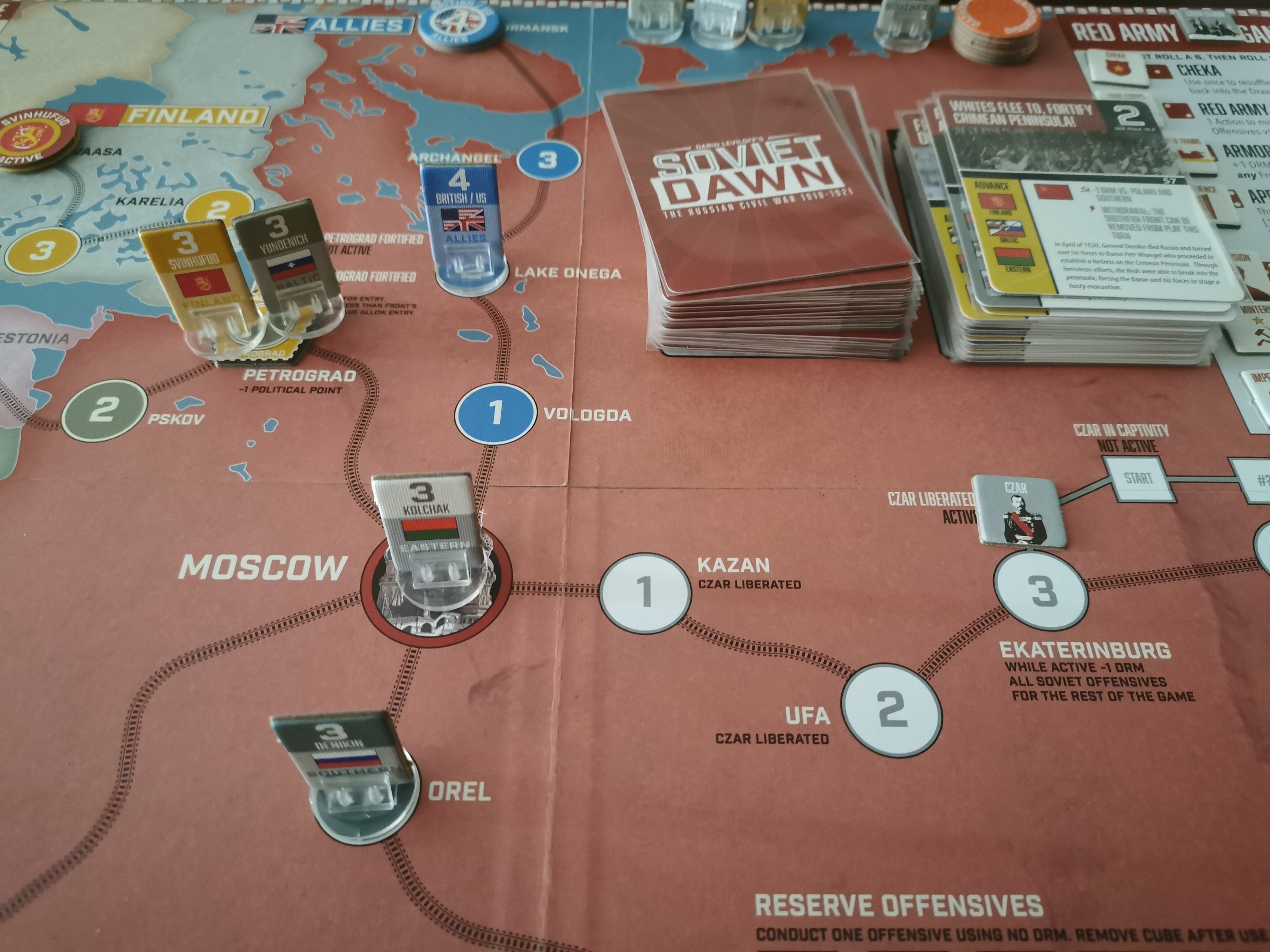 Igual que las anteriores, deberemos lanzar un dado y obtendremos un avanza o retroceso político, dependiendo de su valor. Terminada esta fase, volvemos a comenzar.Esto es, a muy grandes rasgos, la explicación de un turno. Quedaría por explicar para que sirve la fortaleza de Petrogrado, el counter del Czar o de la legión Czech, así como los decretos políticos y la reserva ofensiva. Pero esos detalles o los dejo en el reglamento, para que encontréis el sabor del juego. Si queréis ver un turno de juego, en este vídeo de HomoMeeple encontraréis la versión original y aquí un Gameplay con la edición que estamos reseñando por Bored Online, Board Offline.