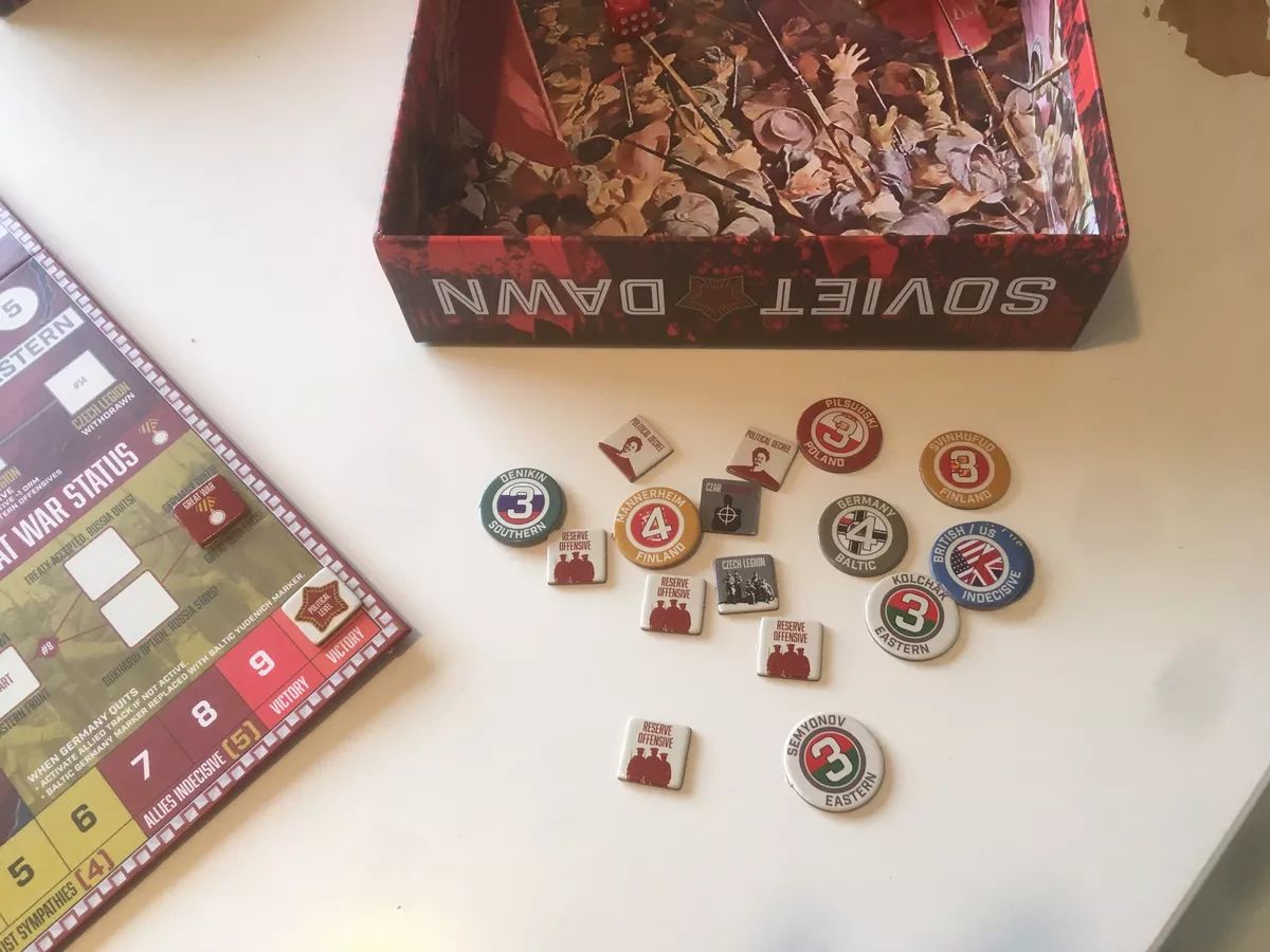 La tabla de reorganización del ejército rojo es una delicia de suculentos y apetitosos dulces. Cada counter es un caramelo que nos ayudará a ser un poco más fuertes frente a las ofensivas, pero es un dulce envenenado, pues sólo se puede acceder a ella con el número seis de un dado. Eso significa, que cada tirada contra esa tabla es una apuesta de fe, con la esperanza de sacar el número milagroso que nos dará el regalo preciado. Puede ser un pozo de ansiedad porque si lanzamos un dado y fallamos, queremos lanzar otra vez y si fallamos, queremos lanzar otra y si fallamos nos daremos cuenta que ya no tenemos acciones y habremos perdido un turno completo.