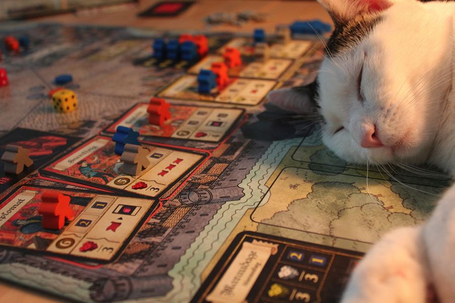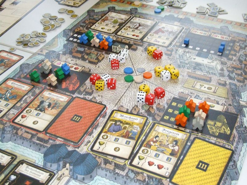 No desearás los dados de tu prójimo Nos encontramos ante un eurogame de colocación de trabajadores y gestión de dados, en el que encarnaremos a una familia adinerada francesa de la provincia de Champange y más concretamente en la ciudad de Troyes. Esta vez no tendremos que construir una catedral o un castillo, sino que intentaremos obtener prestigio con nuestros trabajadores, enviándoles a los tres estamentos destacados que son: militar, religioso y civil. Ya de por si un tema apasionante que engancha a todos los jugadores (ironía nivel Sheldon Cooper).El juego es un euro de manual: colocar trabajadores, pagar el coste correspondiente y obtener los beneficios. Para ello dispondremos de un ejército de meeples que deberemos ir contratando a medida que los necesitamos, obviamente a un precio. En este juego existen dos tipos de moneda: los deniers que servirán para realizar el pago y la influencia que es un marcador que nos servirá para pagar diferentes tipos de acciones. Tener el control de ambos y encontrar el equilibrio nos ayudará a continuar jugando de una manera fluida, sin estar asfixiado.Pero vayamos por partes. El juego tiene cuatro motores esenciales: las cartas blancas o religiosas, las cartas rojas o militares y las cartas amarillas o civiles. Estas cartas se colocarán cerca de los edificios de cada poder y en esos edificios colocaremos a nuestros trabajadores. Estos edificios son vitales, ya que por cada trabajador que tengamos en los edificios al principio de cada turno nos darán un dado de ese color y los dados son las entradas a las cartas para colocar trabajadores. Porque las cartas, que irán apareciendo ronda a ronda, nos permitirán colocar un máximo de un trabajado de nuestro color, pero sólo los dos primeros trabajadores obtendrán puntos de victoria. Estamos en un euro, aquí se viene a conseguir puntos de victoria.