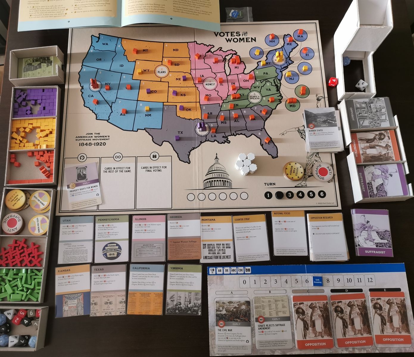 Si colocas activistas en un estado, es porque quieres conseguir la carta extra. Eso sin olvidar el conjunto global del país. El juego se vuelve mucho más estratégico.Los eventos de las cartas son medianamente buenos, ya que permiten ir colocando cubos de seguidores por el tablero jugando los eventos, pero si los sacrificas y los conviertes en acciones de campaña, puedes hacer crecer mucho más rápido tus seguidores por todo el país. Ahí es donde debes aprender cuando sacrificar un evento y convertirlo en algo mucho más positivo, ya sea la acción de campaña y jugártela a los dados, agarrar nuevos botones porque hay una carta de estrategia que te ayudará o en acelerar el ritmo del congreso y con muchos seis, conseguir que la decimonovena enmienda sea un hecho. En este juego no existen los puntos de acción, es un todo o nada, el evento o otra acción.Si no estás familiarizado con las abreviaturas de los estados, la propia editorial ha publicado en la BGG un documento que hace referencia a esta información. Hubiese estado mejor como hoja interna de ayuda al jugador incluyendo las acciones que se pueden realizar (disponible igualmente en la BGG) o en cartas individuales mucho más manejables. Pero al final, acabas conociendo cada estado y su ubicación, te sirven las cientos de películas y series que has visto.