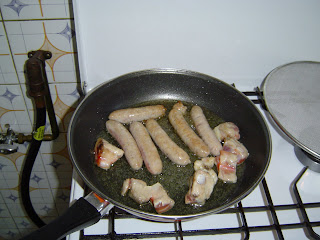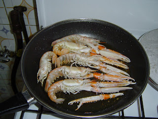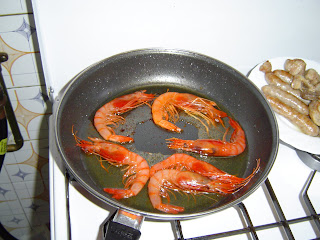 02/ En el mismo aceite de las salchichas y costillas, pasar las gambas y escamarlanes hasta que cojan un poquito de color