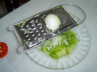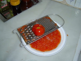 A/ Rallar pimiento verde, rallar cebolla, rallar ajos juntos en el mismo recipiente pues estos se pueden freír juntos.B/ Rallar tomate en otro recipiente, el tomate siempre se añade al final cuando los otros ingrediente estén pasados.