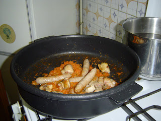 C/ En el tiempo que hemos hecho esto ya estarán pasados todos los ingredientes anteriores costillas, salchichas, calamar y sepia así que ya podremos pasar a realizar el sofrito.