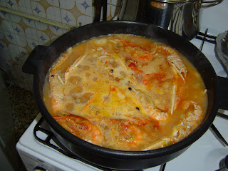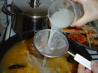 08/ Una vez mezclado todo añadir las gambas y escamarlanes y echar el agua de la cocción de las almejas y mejillones colada previamente. Añadiremos también 2 puñaditos de sal gruesa de cocina.